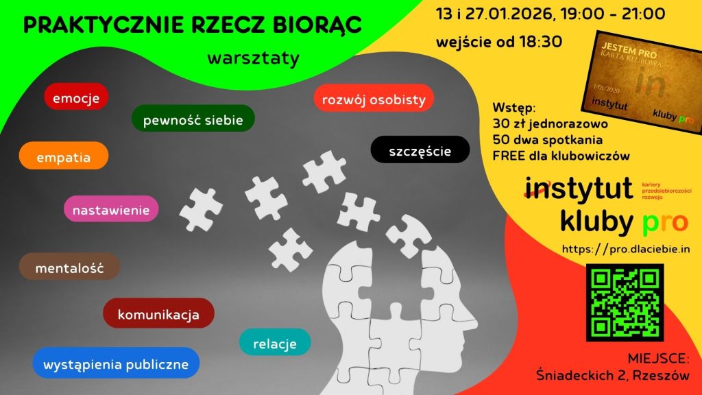 “Praktycznie rzecz biorąc” to warsztaty, podczas których od strony praktycznej podchodzimy do pracy nad sobą. Są one częściowo rozwinięciem tego co było podczas cyklicznych Klubów Praktycznego Rozwoju Osobistego oraz ćwiczeniem umiejętności miękkich, które rozwijać powinien każdy z nas. Jeżeli: – chcesz popracować nad pewnością siebie, – chcesz odkryć swój potencjał, – występujesz lub chcesz występować publicznie, – interesujesz się aktorstwem, – pracujesz lub chcesz pracować w sprzedaży i obsłudze klienta, – pracujesz z ludźmi, – chodzisz na rozmowy rekrutacyjne, – działasz biznesowo, – często się stresujesz, – marzy Ci się w przyszłości praca na scenie, – chcesz wzmocnić siebie, – chcesz poznać inne ciekawe osoby, to zapraszamy Cię na nasze warsztaty, które odbywają się co dwa tygodnie w środy o godz. 19:00 i trwają 2 godz. Nie musisz mieć doświadczenia W trakcie warsztatów głównie pracujemy nad: – technikami komunikacji, – postawą ciała oraz jego mową, – oddechem, – odwagą, – pewnością siebie, – mentalnością, – konsekwencją w działaniu, – wytrwałością, itp. ======================================= Twoja inwestycja: podczas rejestracji obowiązują następujące zasady zakupu biletów: bezpłatnie – posiadacze Karty Jestem PRO (kupisz na https://karta.dlaciebie.in) 30 zł – jednorazowo, 50 zł – miesiąc, 200 zł – cały rok od daty zakupu (kata JESTEM PRO), Kup Kartę JESTEM PRO i uczestnicz w Klubach i innych wydarzeniach bez dodatkowych opłat oraz korzystaj z oszczędności min 1500 zł na warsztaty i szkolenia w Instytucie. Dołącz do społeczności ludzi PRO (Opłata za kartę – rok członkostwa – 200 zł)